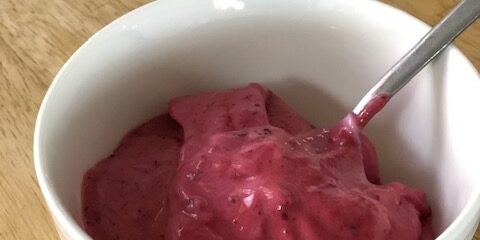 Además, al acompañarlo con el queso batido, aportamos una gran cantidad de proteínas saludables, calcio, con un bajo aporte calórico y una alta capacidad saciante. Es ideal para todas esas personas que están a dieta, pero a la vez quieren un capricho fresco. Se puede poner un poco de miel si queremos rebajar un poco la acidez del helado, pero poco. Y además podemos acompañarlo con “toppings de chocolate negro” que le darán una chispa especial y también nos reportará beneficios nutricionales.